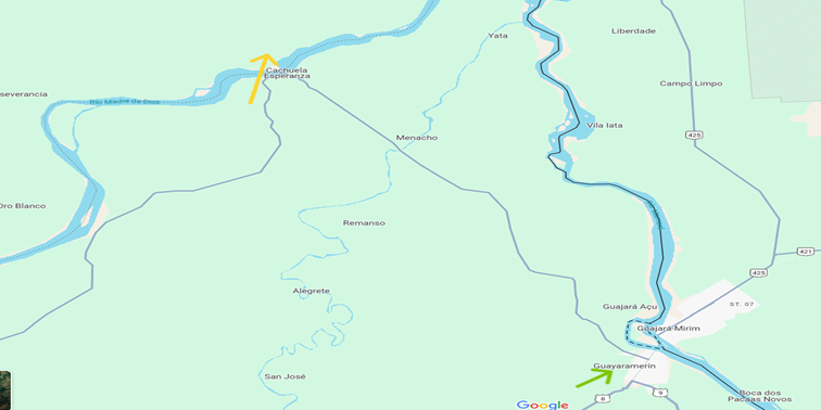 Auf der Karte gelber Pfeil = Puerto Consuelo; grüner Pfeil = Guayaramerín